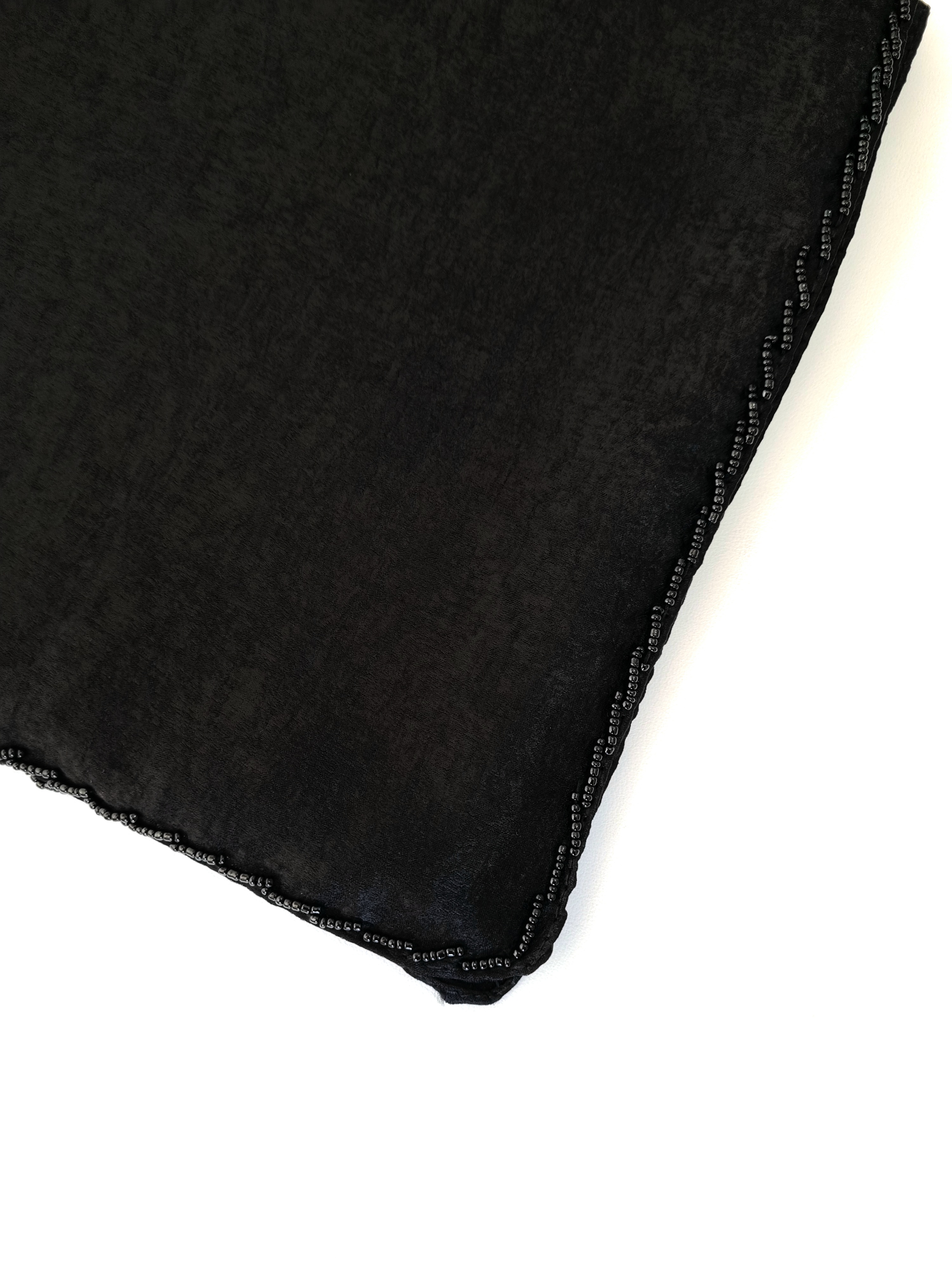 روسری مشکی مجلسی ملیله دوزی شده دست دوز بسیار با کیفیت جنس پارچه کوپرا چهارفصل بسیار باکیفیت بدون دون و پرز بدون چروک پذیری نیازی به اتو کردن نداره ایستایی فوقالعاده عالی و راحت روی سر لیز نیست و سر نمیخوره بدون گیره و با گره زدن فیکس میشه روی شونه ایستایی نداره کاملا مشکیه و اصلا بور نیست